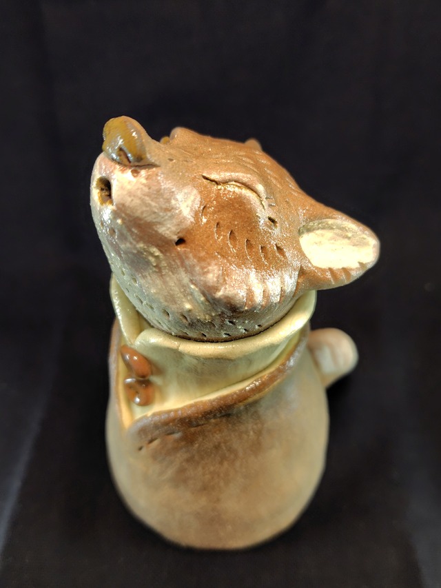 ワオ~ン。遠吠えするイヌ科の紳士。振るとコロコロと音がします。 高さ:12センチ 素材:信楽土、半磁器土、黄瀬戸釉、色化粧土 ※この作品は「ぼんやりホリデーマーケット」ギャラリー展示作品です。