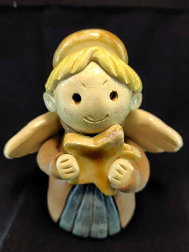 星を持った小さな天使です。振るとコロコロと音が鳴ります。 高さ:12センチ 素材:信楽土、半磁器土、黄瀬戸釉、色化粧土 ※この作品は「ぼんやりホリデーマーケット」ギャラリー展示作品です。