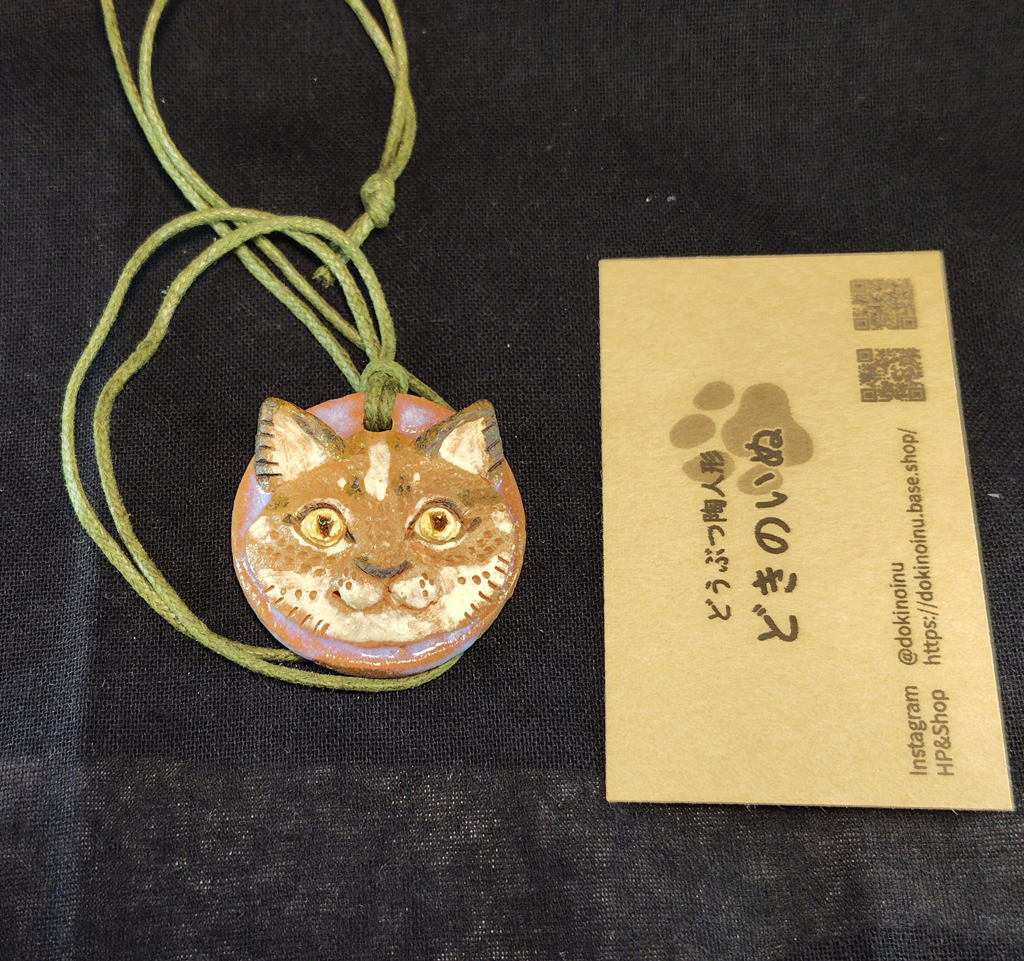 ワイルドキャット風猫のペンダントトップ。付属の紐は簡単に外せるので、お好きなものと交換できます。 直径:4.5センチ 素材:信楽土、萩釉、黄瀬戸釉、化粧土、鉄赤絵の具